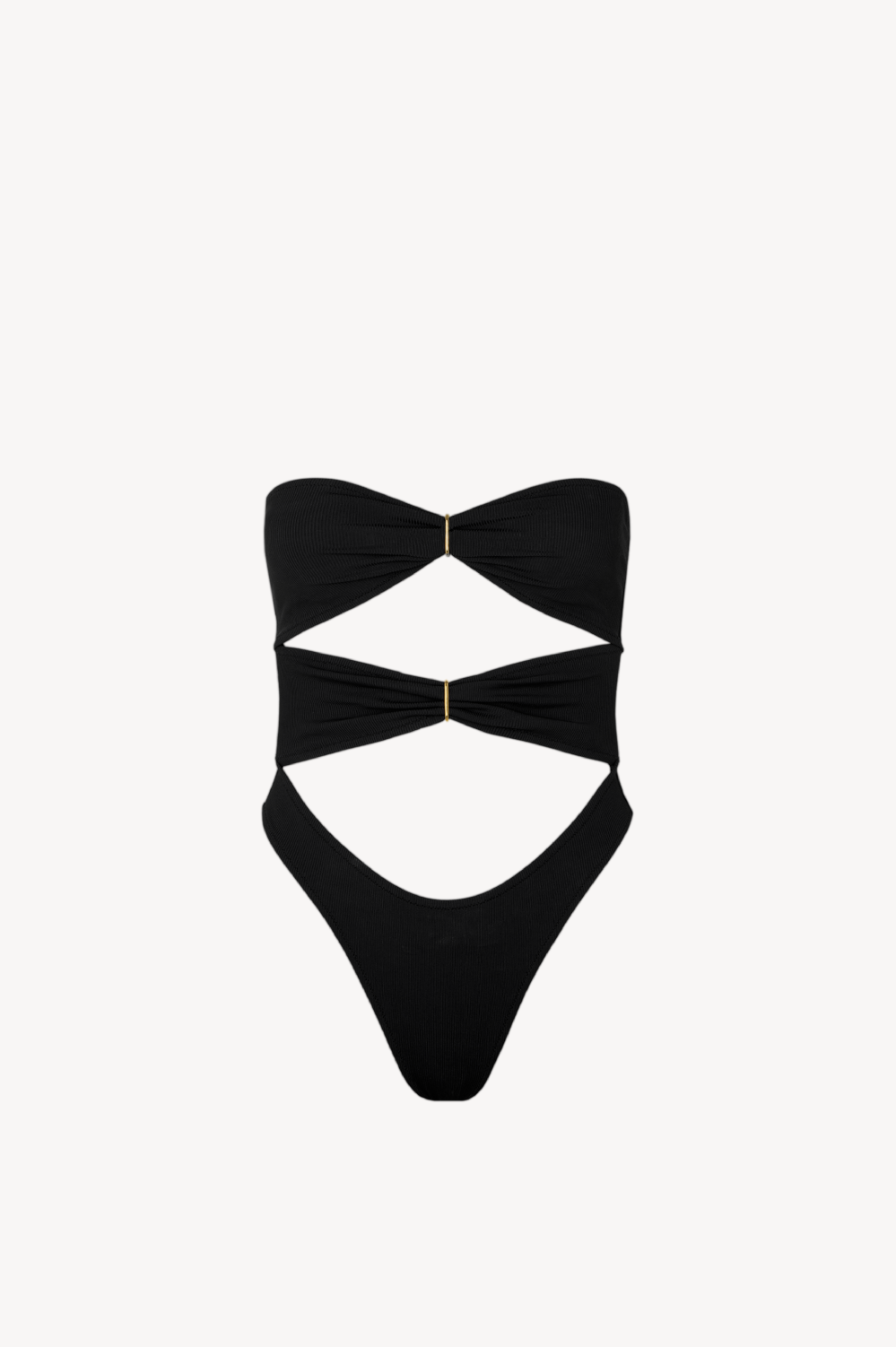 The Charlotte One Piece is a bold strapless one-piece with waist cutouts front and back. It’s a versatile design that can be worn from day to evening as a bodysuit.