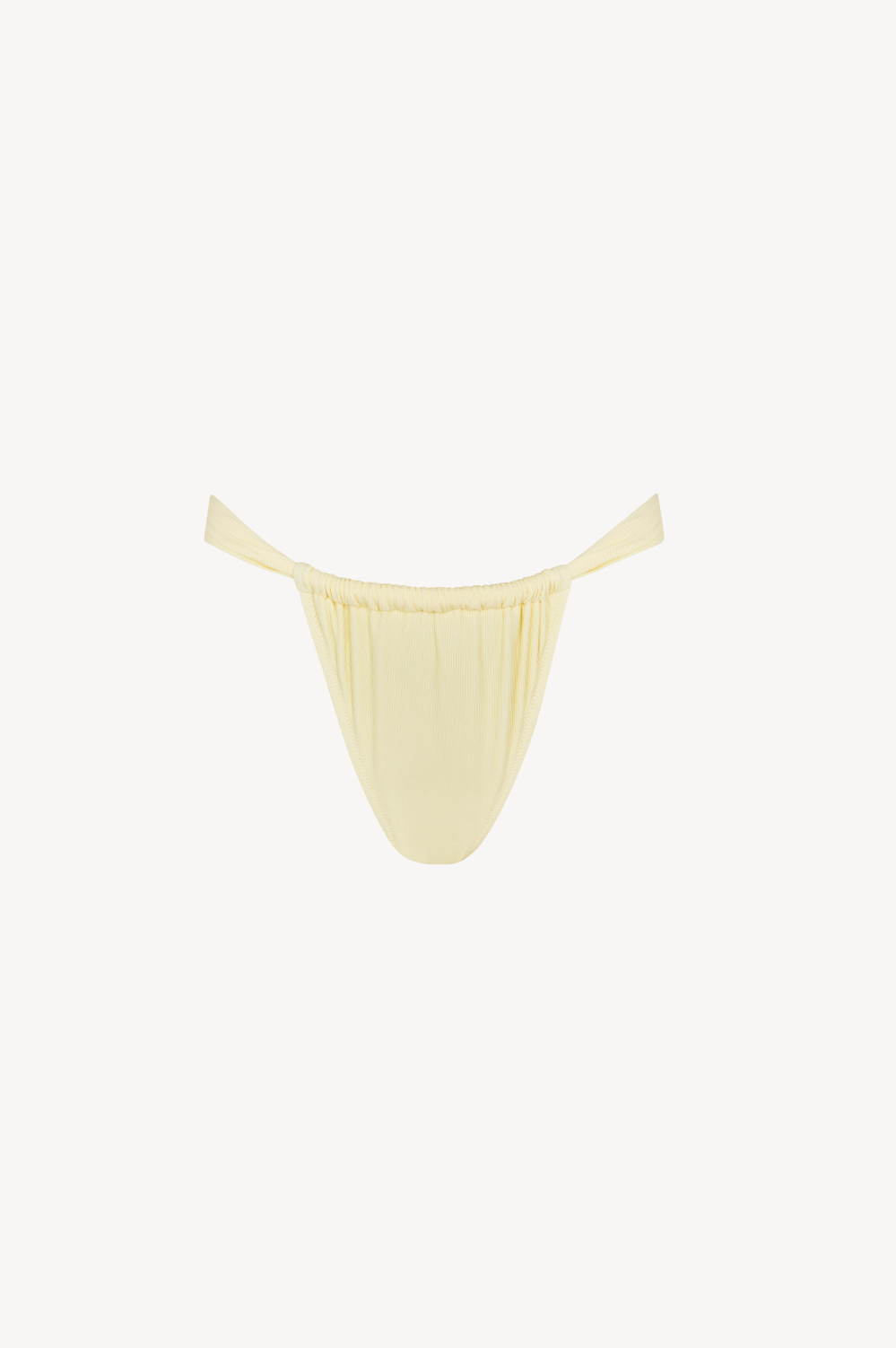 The Lara is a bikini bottom featuring a wider seamless band and adjustable ruched front and back for minimal to cheeky coverage.