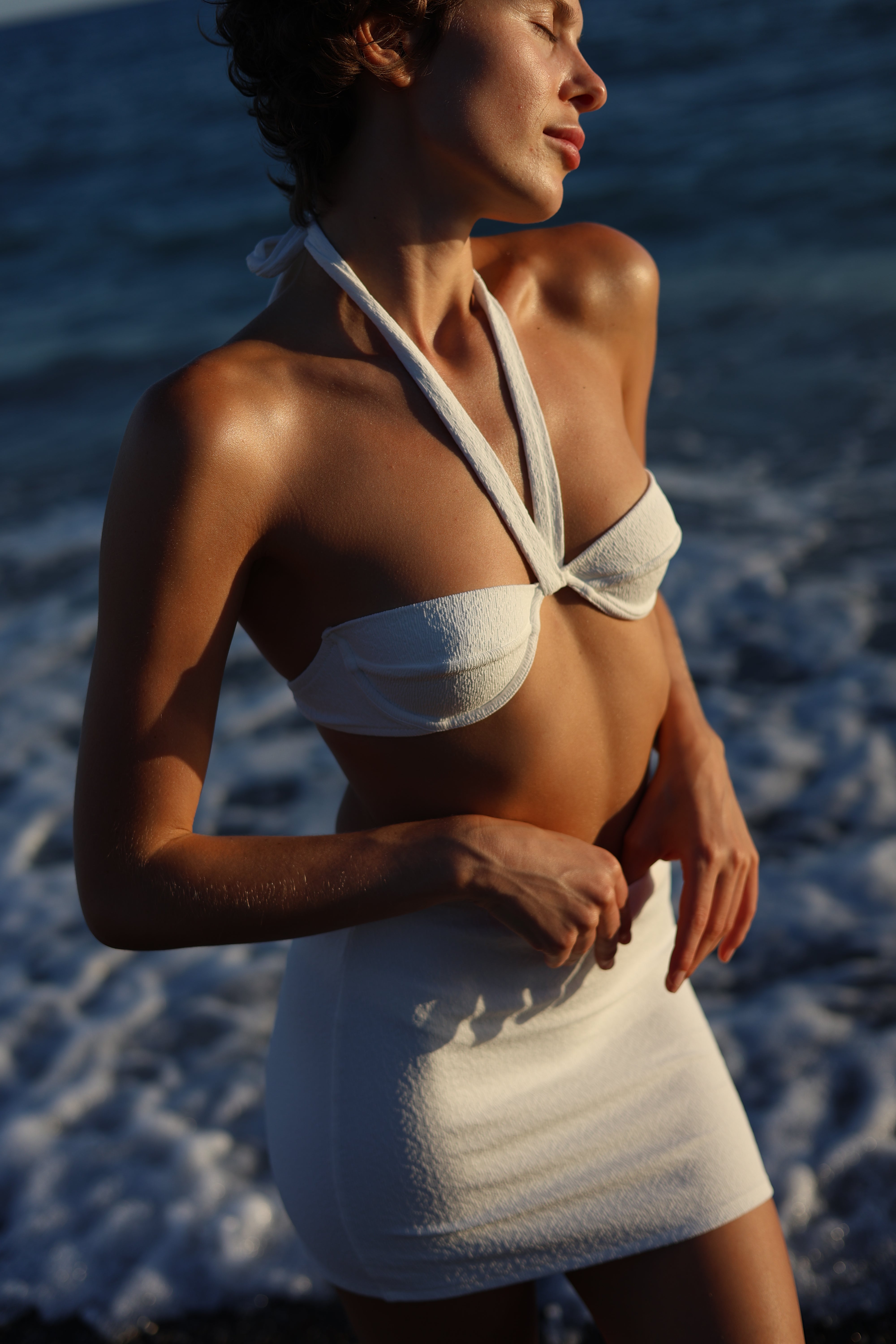 The Cora mini skirt, made from recycled crinkle fabric, is more than just a cover-up. Effortlessly complementing our bikinis, this low-rise style elevates your beach look.